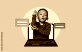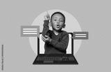 A boy is speaking with a raised hand in front of a laptop. He seems to be participating in an online class. The background is bright yellow with speech bubbles around him.