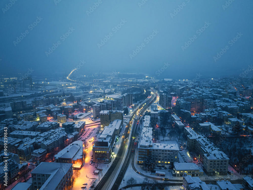 Aerial view of Winter Landscape of a Snow-covered Buildings with Rooftops in the City Centre and central square skyline Varna, Bulgari
