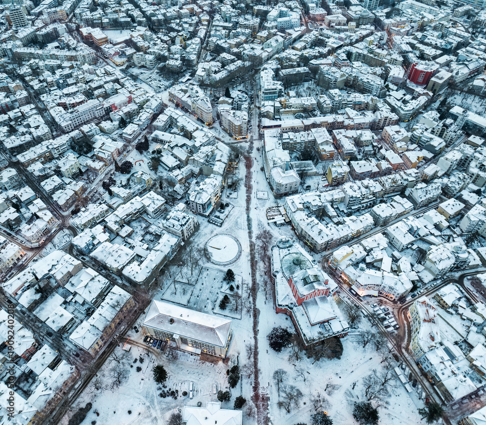 Aerial view of Winter Landscape of a Snow-covered Buildings with Rooftops in the City Centre and central square skyline Varna, Bulgaria