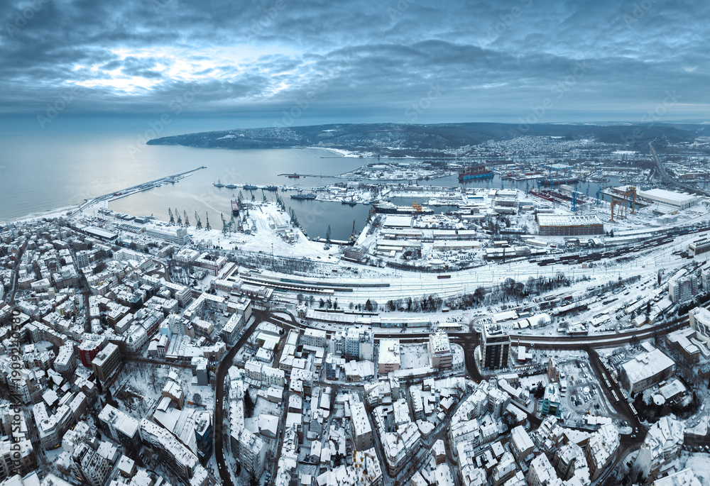 Aerial Winter View from drone Of Snowy City and industrial buildings, Sea Port Varna Harbor With Cranes, Black Sea coast Bulgaria