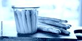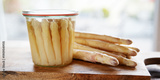 White asparagus spears stand upright in a preserving jar on a wooden cutting board, alongside a bunch of fresh, grown asparagus in a sunny kitchen scene. Inviting backdrop for seasonal vegetable.