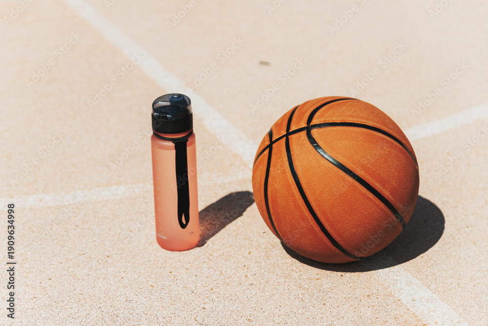Basketball ball and plastic bottle with water on court. Summer outdoors activity.