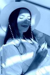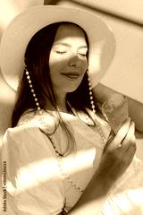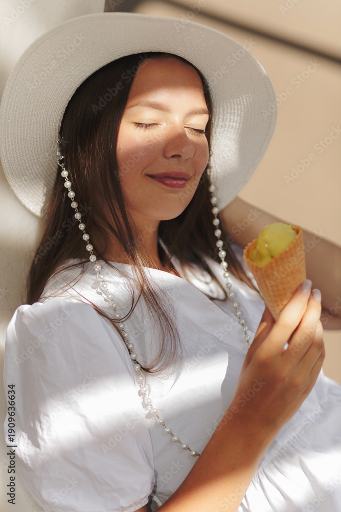 Young caucasian woman eating ice-cream during summer sunny day. Brunette wears white dress and hat