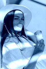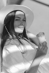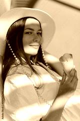 Young caucasian woman eating ice-cream during summer sunny day. Brunette wears white dress and hat