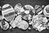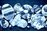 Spring or Easter grazing board theme table scene against a dark wood background. Top down view. Selection of sweets and cheese, meat and fruit appetizers.