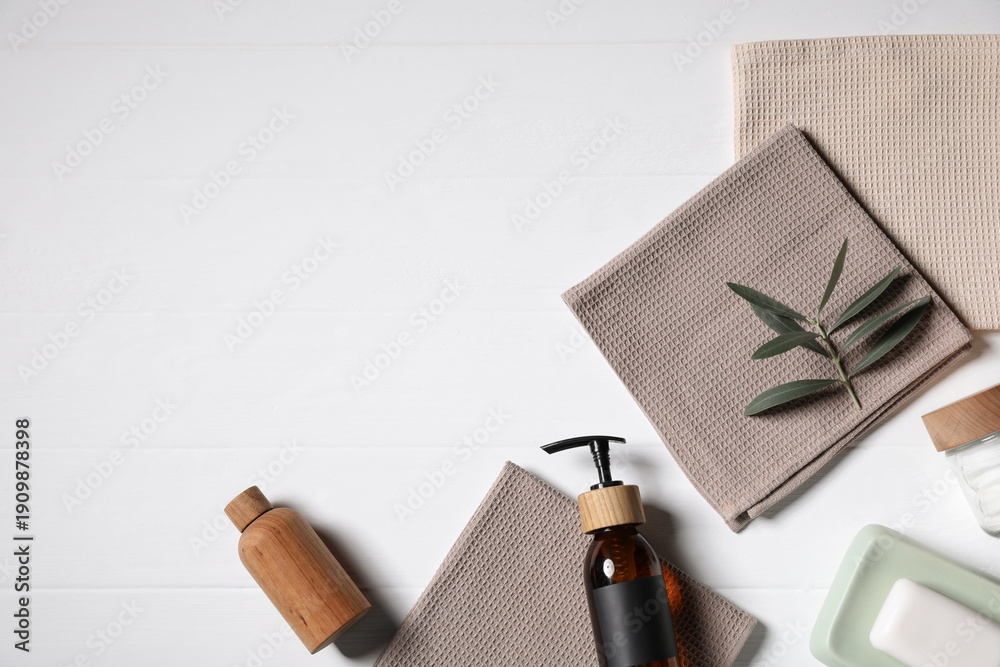 Towels, cosmetic products and green leaves on white wooden table, flat lay. Space for text