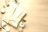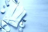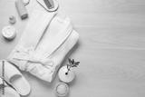 Flat lay composition with bathrobe and spa essentials on white wooden background. Space for text