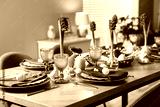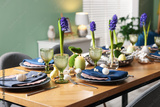 Easter celebration. Festive table setting with flowers and painted eggs indoors