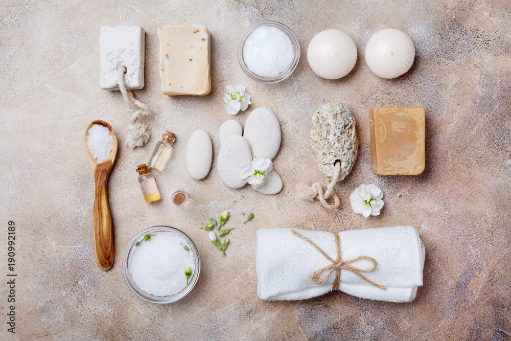 Spa setting for body care and relaxation on stone background top view. Flat lay.