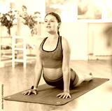 Young girl is engaged in physical exercises, yoga practice. She performs bhujangasana, dog face up, cobra pose in cozy and bright studio alone