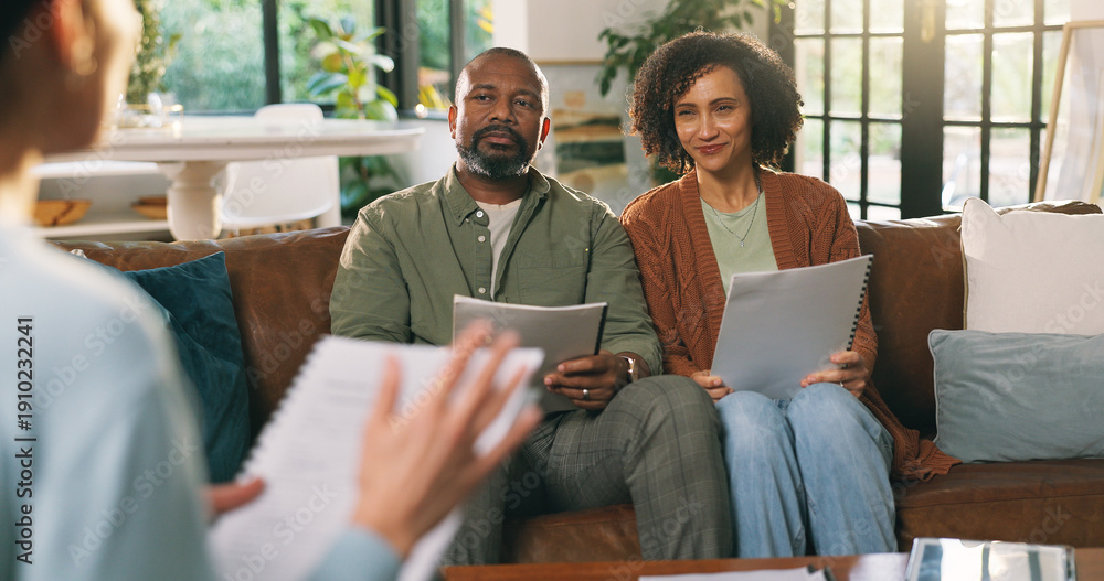 Mature couple, agent and document at house for consultation of mortgage application. Realtor, talking and people with home loan form, property purchase and real estate advisory for finance assessment