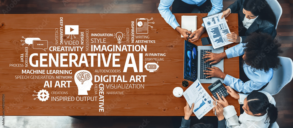 Panorama top view multiracial analyst team use BI dashboard display on laptop screen, analyzing financial data for strategic decision. Fintech analyzes marketing indicators. Concord Amity