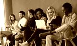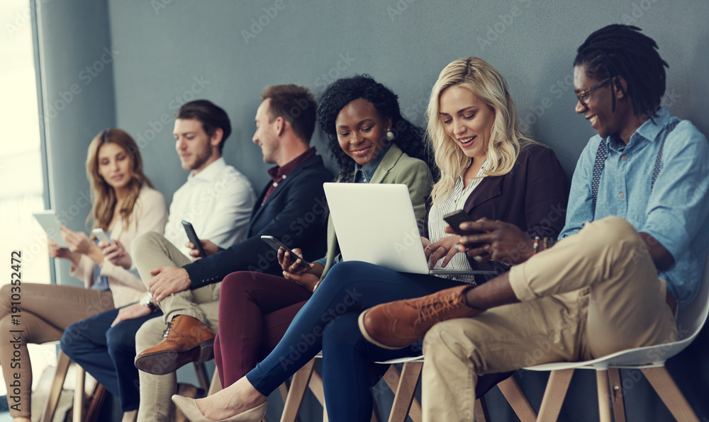 Recruitment, office and queue of people with tech, application and paperless interview. Hiring, waiting room and candidate group for human resources, job opportunity or row for work onboarding