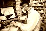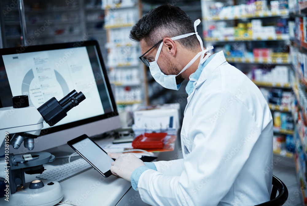 Tablet, pharmacy and face mask with man in store for drug development, healthcare formulation chart and research. Medical, clinical trial and online lab report with mature person for science study