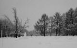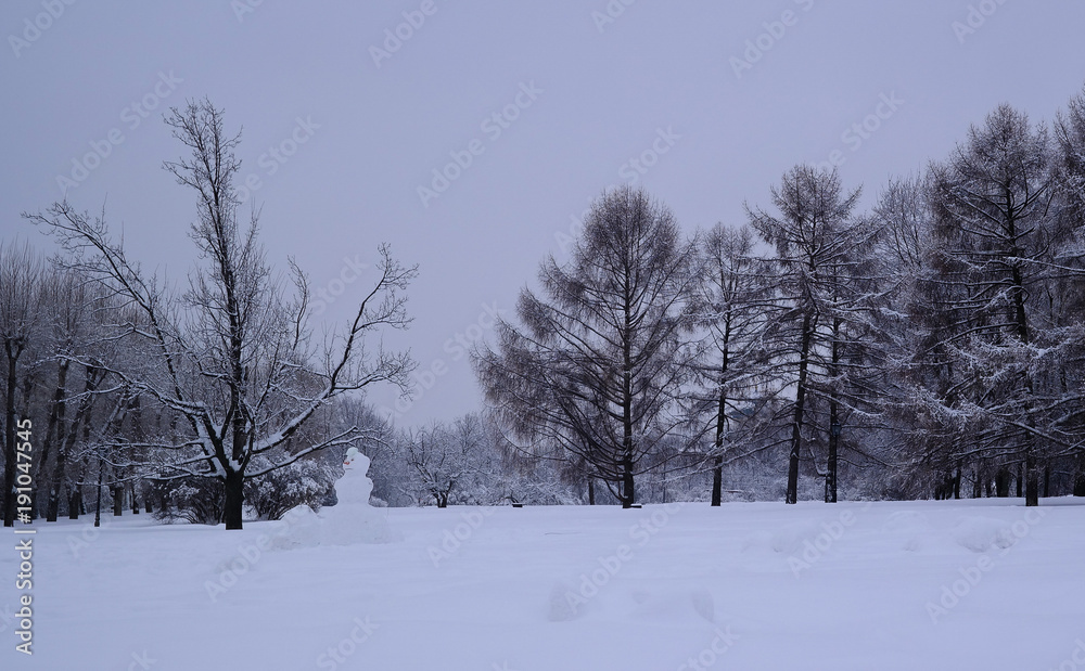 mixed forest in the Kolomenskoye estate and snowman after snowfall, Moscow, Russia
