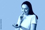 Beautiful young woman with chocolate covered strawberry and fresh berry on blue background