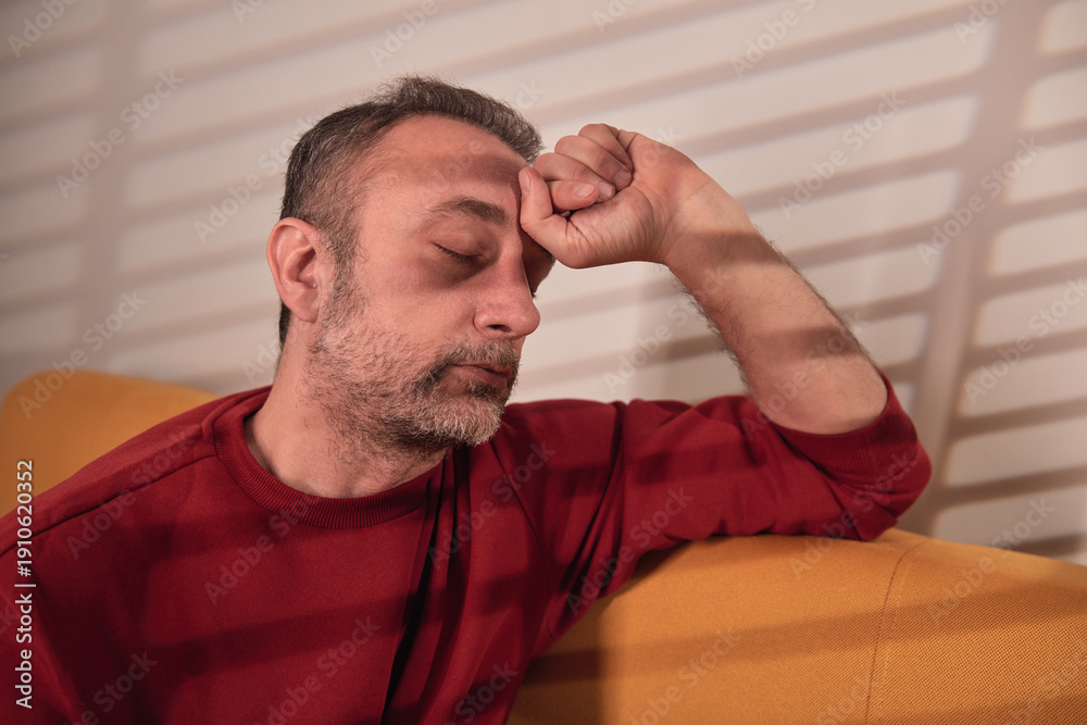 Man with headache, depression, sadness and loneliness sitting on a couch at home
