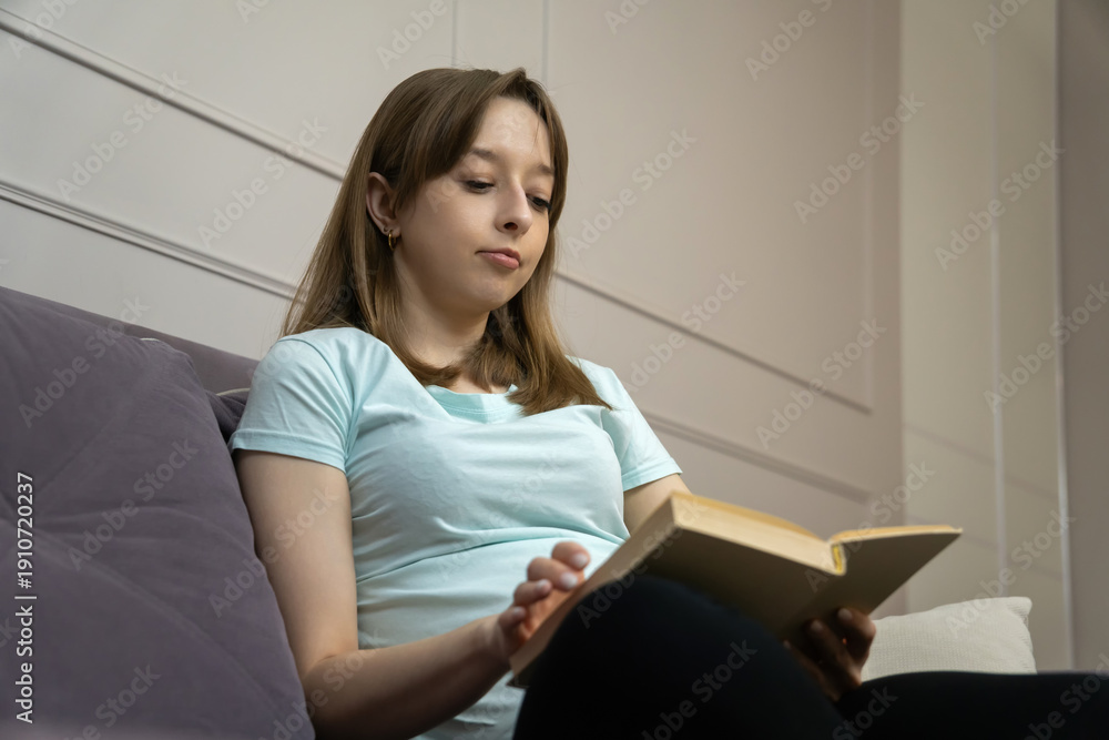 Beautiful young woman holding a book while relaxing on a cozy sofa at home, enjoying moments of leisure and tranquility in her quiet space