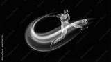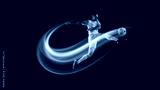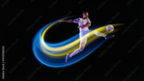 Dynamic poster. Soccer player kicking ball with blue and yellow neon light trails. Concept of sports ads, championship promo visuals, football tournament banners, and fitness motivation campaigns.