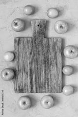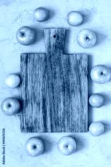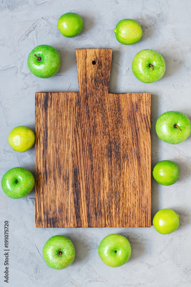 An empty wooden cutting board on a gray concrete background is surrounded by green apples and lime.