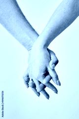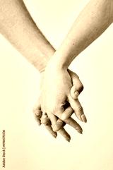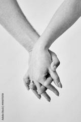 Two hands held together in grasp against neutral background. Close up of man's and woman's hand. Concept of intimacy, support, and trust. Black and white image.