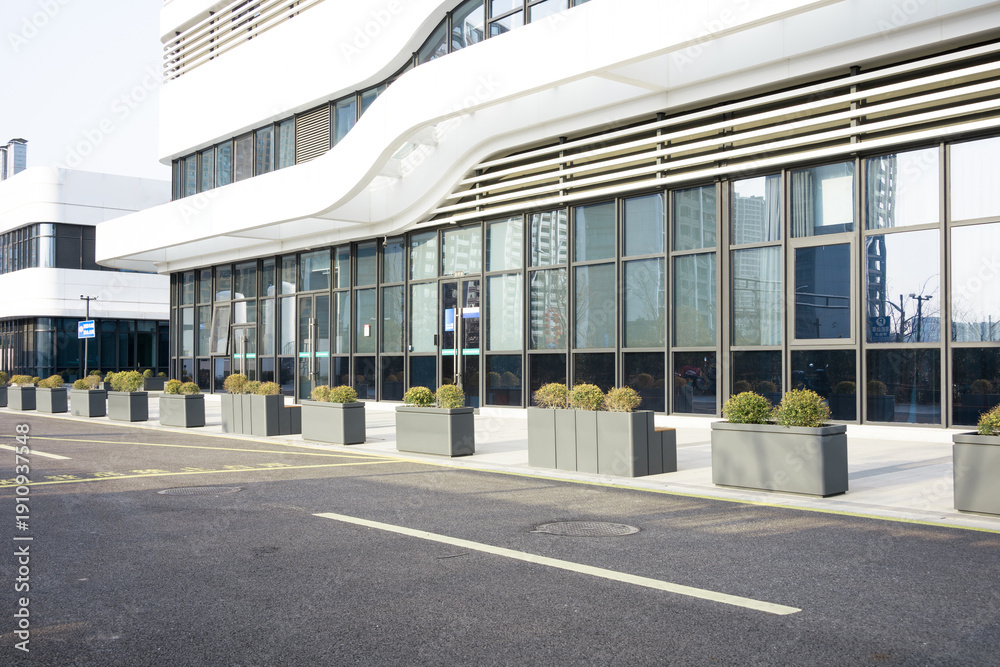 Modern hospital building facade with glass curtain wall and green planters along the street