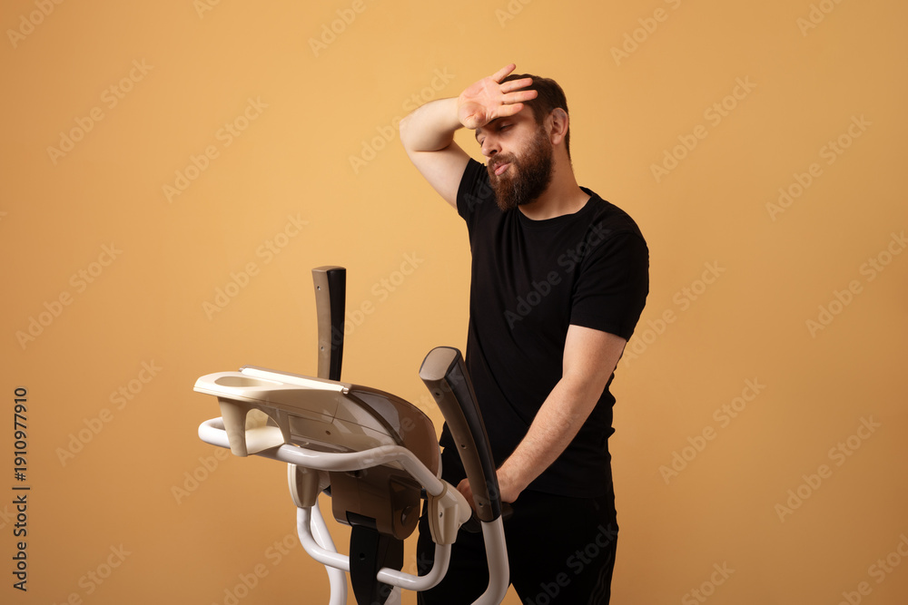 Bearded man in black sportswear looking fatigued while using a stationary exercise bike against a plain tan background.