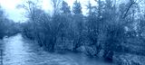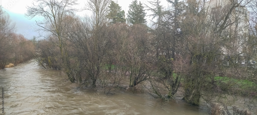 Paisaje fluvial de un río caudaloso bordeado por árboles frondosos sin hojas en un día nublado en Burgos, España