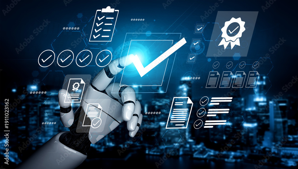 A robotic hand engages with a digital interface featuring checkmarks and visual elements, illustrating the fusion of technology and automation in urban environments. Gantry