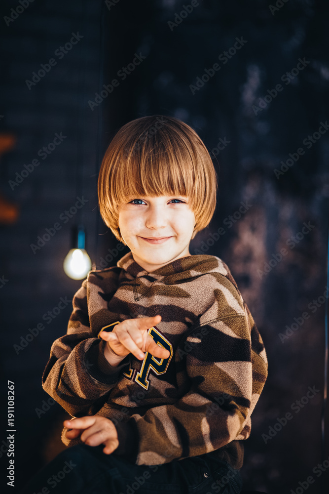 Portrait of happy blonde little boy smiling cheerfuly whith teeth on white blurred background. Kid laughing close up