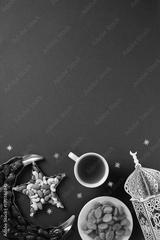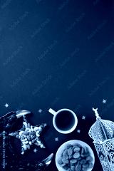 Ramadan food background with top copy space. Vertical composition featuring dates, nuts, dried fruits, and Arabic lantern on dark blue surface. Ideal for festive greeting cards.