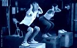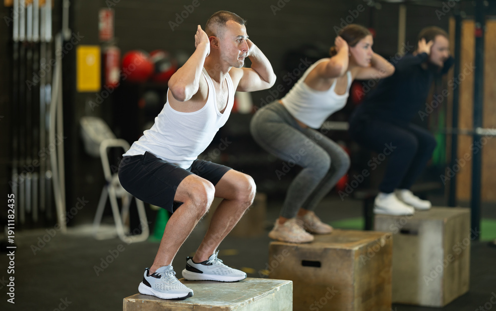 Athletic man participating functional cross training at gym, jumping up on wooden box with squatting position, focusing on strengthening leg muscles