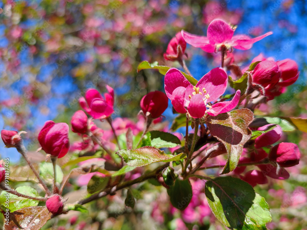 Bright pink apple blossoms bloom on a tree branch against a blue sky