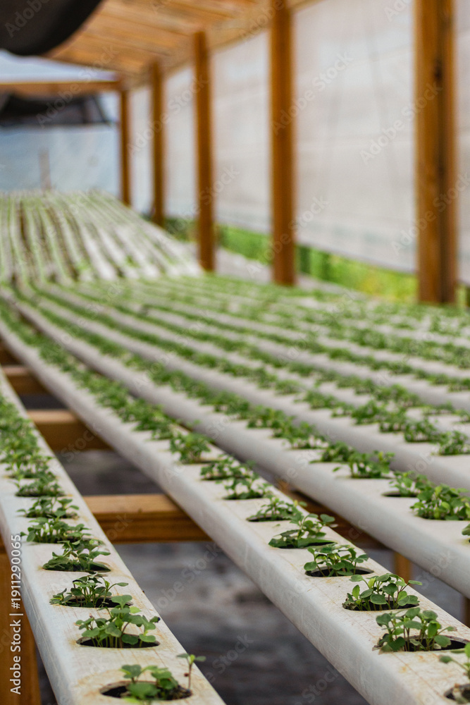 Young green plants thriving in a sustainable hydroponic system inside a modern greenhouse