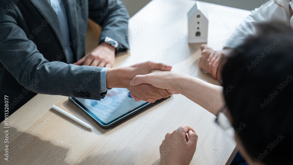 Close up of a real estate agent and client shaking hands for a successful home insurance deal or property mortgage. Concept of house buying, financial agreement, and investment security at office