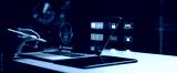 Cybersecurity professional analyzing AI deepfake detection system with facial recognition scan, fraud warning alerts, and digital identity protection interface on laptop.
