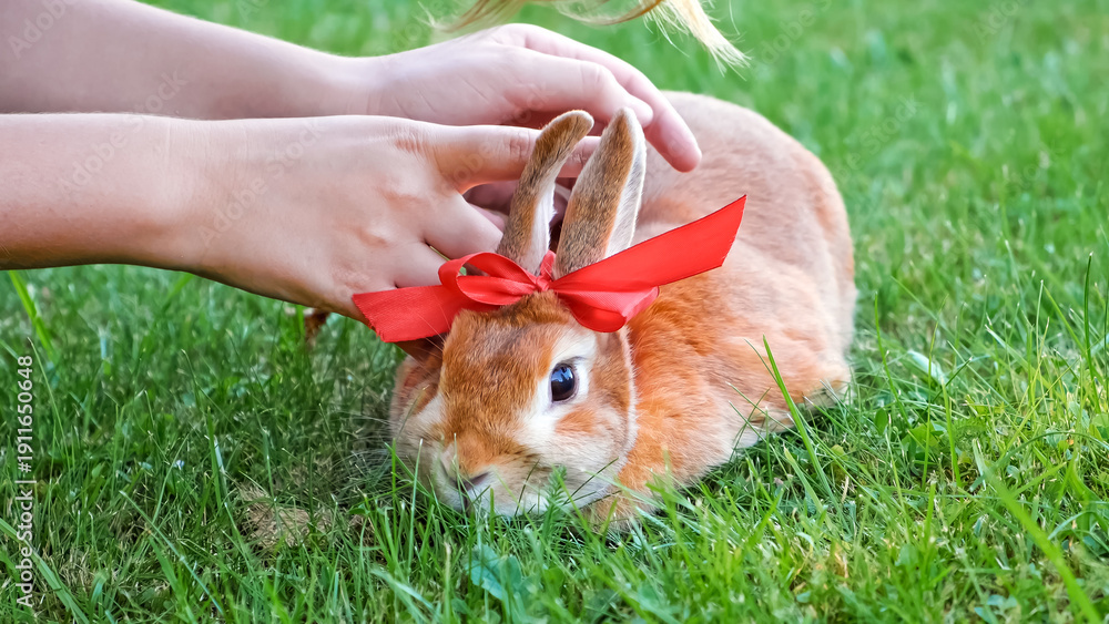 Human hand petting Easter bunny. Beige fur rabbit wearing a red ribbon bow on head, looking at camera sitting outdoors on green grass background. Decorative animal. Religion holiday. High quality 4K.