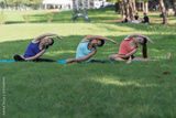 Family practicing yoga in the park outdoor. Concept of healthy lifestyle and relaxation..