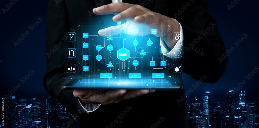 Businessman in Suit Demonstrates Advanced Technology Interface with Digital Connectivity and Data Visualization in Urban Nightscape Quark.