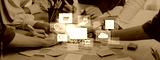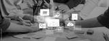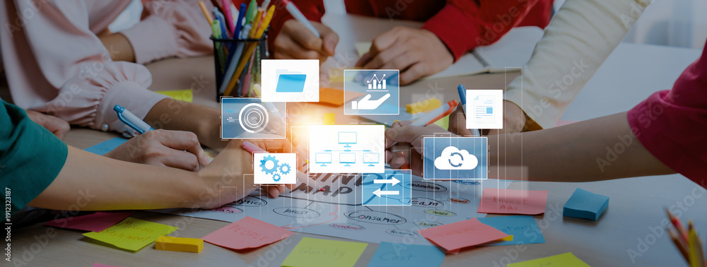 Teams collaborate in a vibrant workspace, utilizing sticky notes and digital graphics to streamline project management and foster innovative ideas in a dynamic environment. Trope