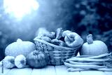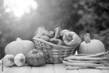 Harvest. A basket of fresh vegetables tomatoes, peppers, garlic, and green beans rests on a wooden surface illuminated by sunlight.