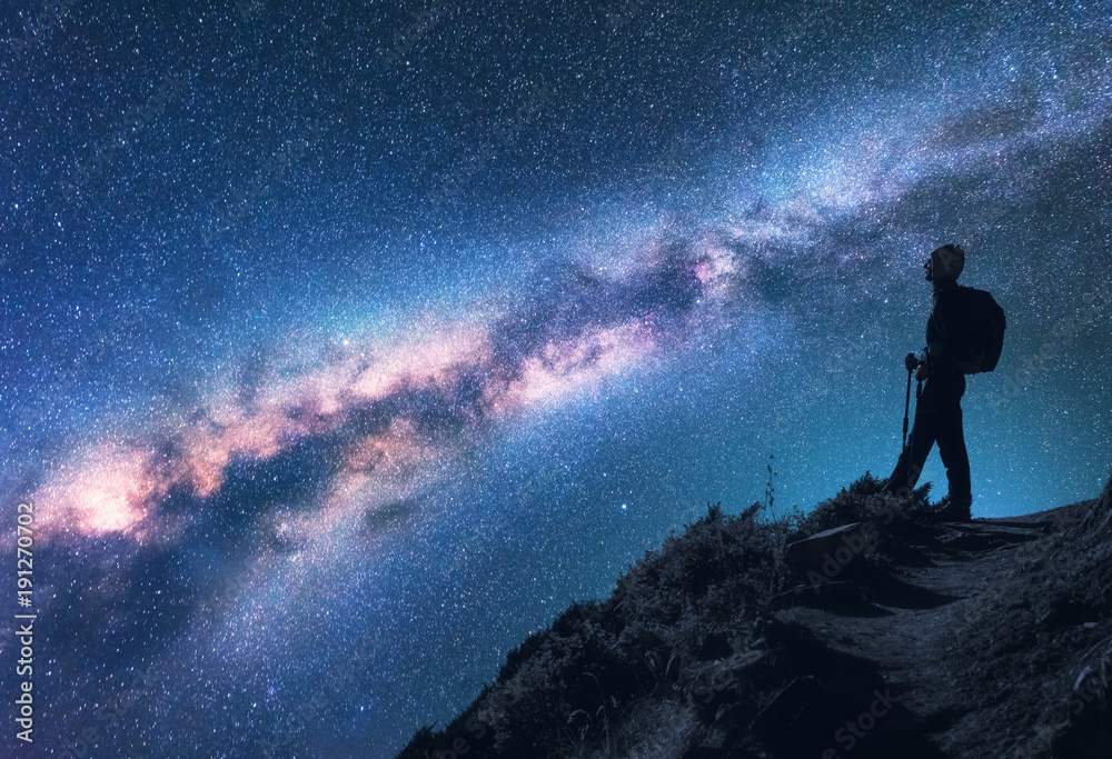 Space with Milky Way. Silhouette of a woman with backpack at night. Girl on the mountain peak and starry sky. Sky with stars and woman. Trekking. Night landscape with bright milky way and traveler