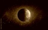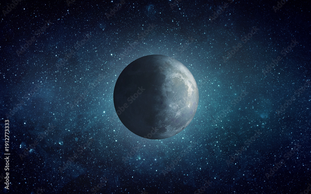 Moon in outer space against a starry sky, half illuminated and half in shadow. Detailed lunar surface with craters surrounded by deep blue space, stars. Elements of this image furnished by NASA