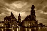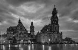 Evening view of Dresden Cathedral and historic buildings at Theater Square with illuminated baroque architecture and wet cobblestone reflections in the old town of Saxony, Germany
