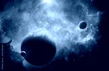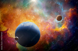 Collage of outer space featuring planet Earth in the foreground with visible atmosphere, the Moon nearby and Mars in the distance. Colorful nebula, stars. Elements of this image furnished by NASA.
