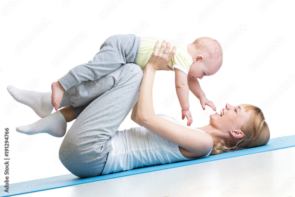 Young adult woman holding her baby son on her knees while doing yoga fitness exercises. Isolated on white background.