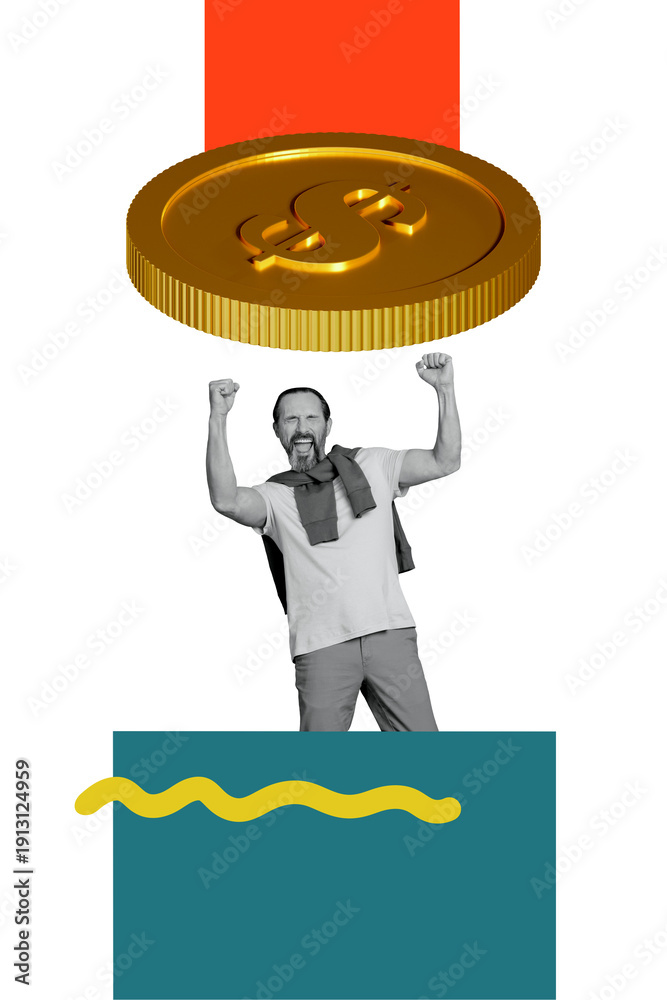 Creative composite sketch design artwork collage of aged man success hand fist up achieve goal earnings income bank money wealth huge coin