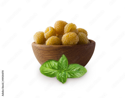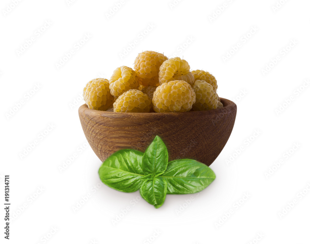 Raspberries in a wooden bowl with basil isolated on white background. Vegetarian or healthy eating. Juicy and delicious yellow raspberry with copy space for text.