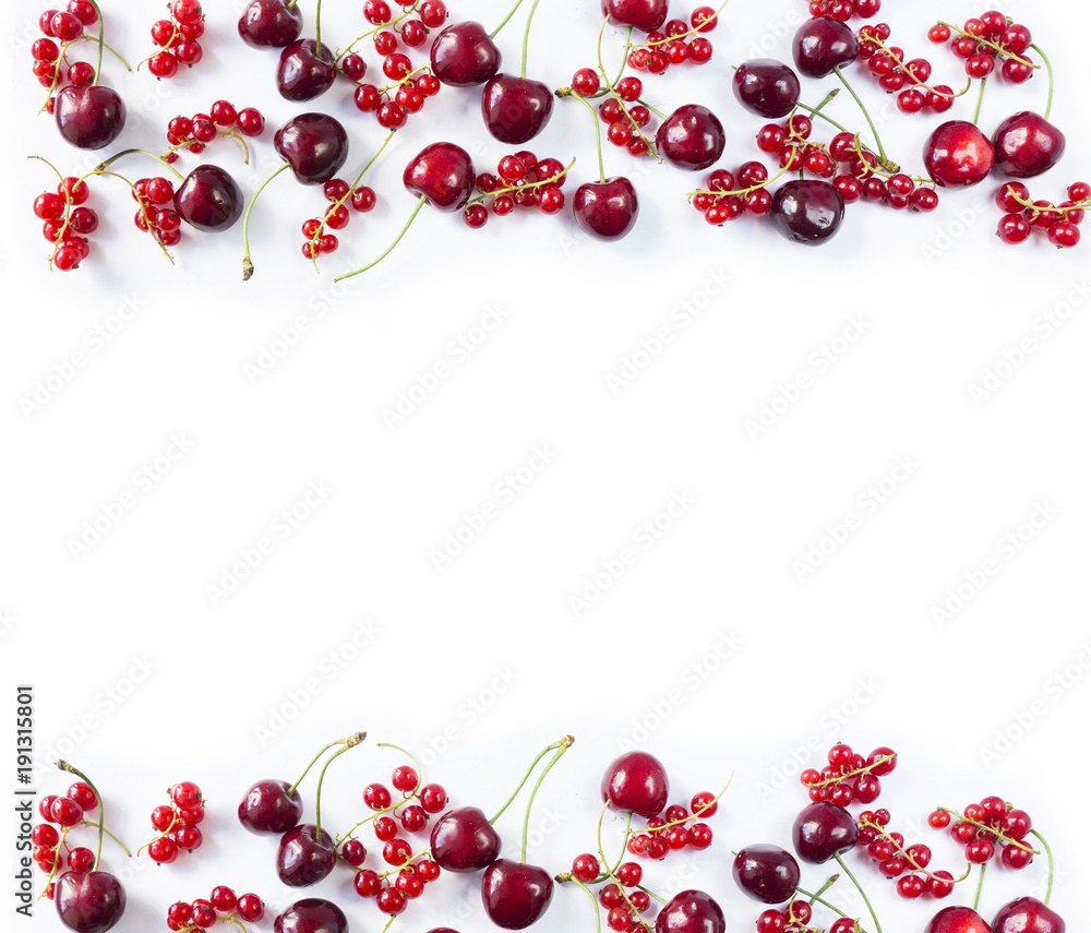 Red food at border of image with copy space for text. Ripe cherries and red currants on a white background. Red berries and fruits. Top view.