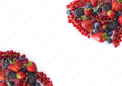 Black-blue and red food on white background. Mixed berries with copy space for text. Various fresh summer berries on white background. Top view.